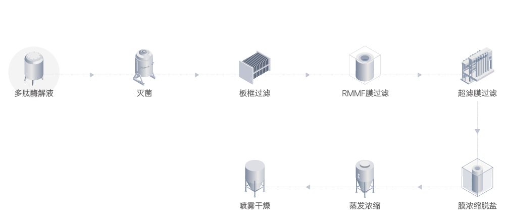 萊特萊德采用先進技術,利用膜產(chǎn)品對肽進行提純,經(jīng)預處理過后的酶解液,通過特種分離膜系統(tǒng)對肽中的顏色及鹽分進行脫除。最終在低溫下實現(xiàn)了多肽的凈化及提純。